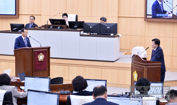 ▲여수시의회 송하진 의원이 1일 제252회 정례회 본회의에서 정기명 여수시장을 상대로 상포지구 문제와 관련한 시정 질문을 하고 있다.
