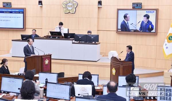 ▲여수시의회 주재현 의원이 지난 1일 정기명 여수시장을 상대로 여수박물관 누수 사고와 관련한 질의를 하고 있다.