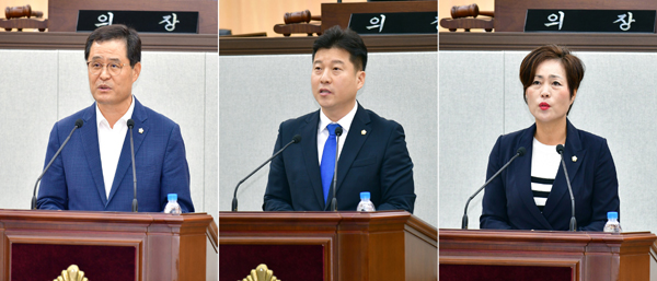 ▲김종길·고용진·정현주 여수시의원이 10일 열린 제250회 임시회에서 5분 자유발언을 하고 있다.